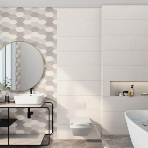 The simplicity and elegance of a white tile with tasteful golden veins is undeniable. No matter the design of your bathroom, it will brighten it up even in the dimmest of lights.