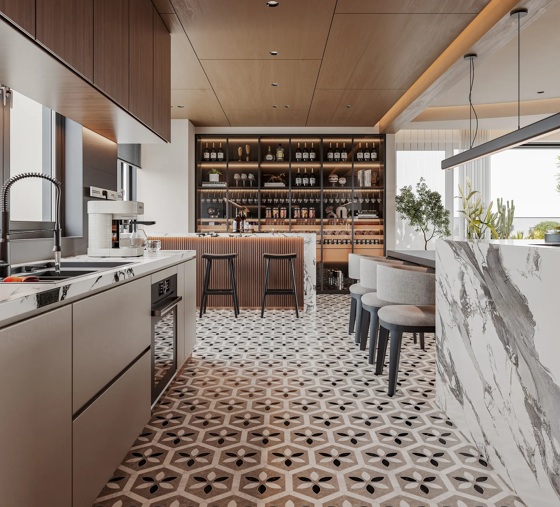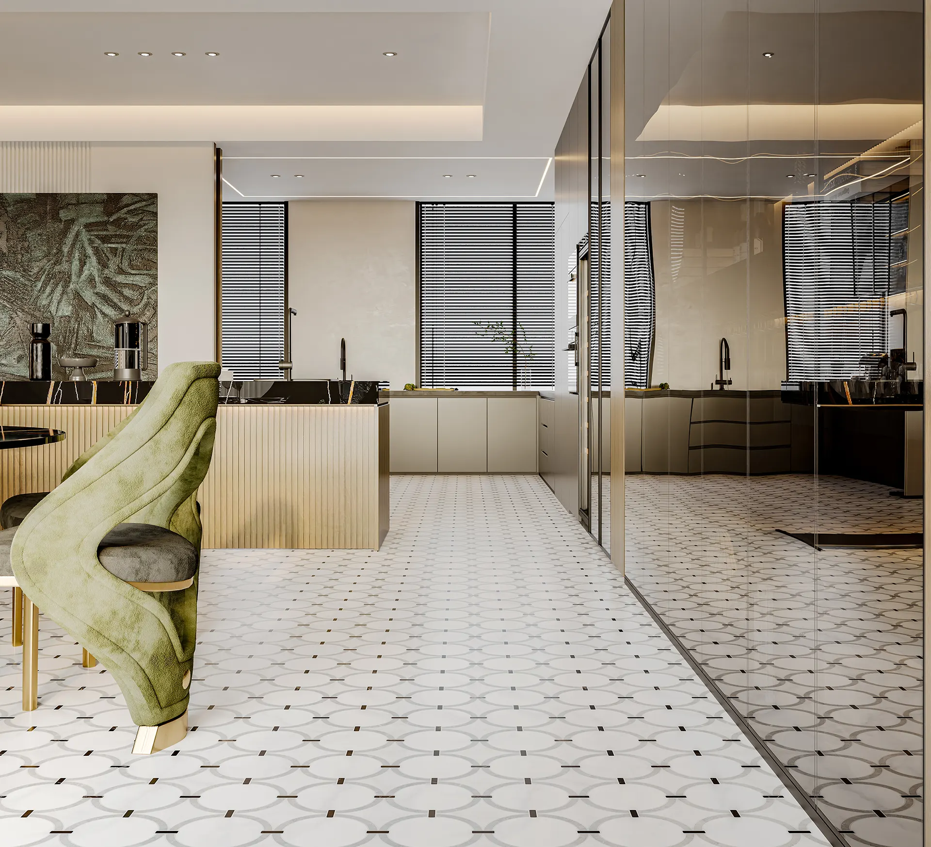 The continuous flow draws the eye outward, visually stretching the floor to make the room feel wider and more airy. It turns a simple surface into a grand, expansive foundation.