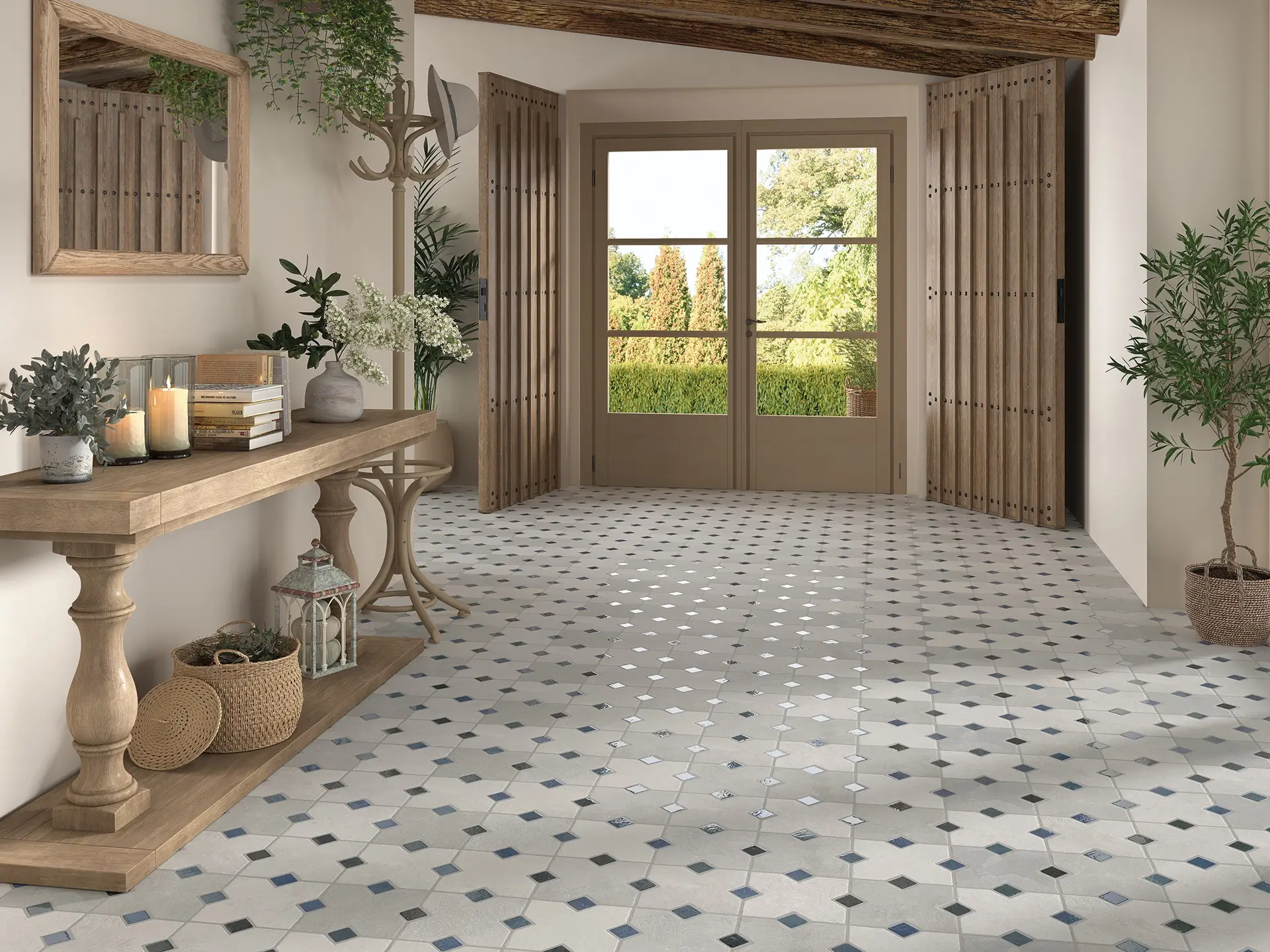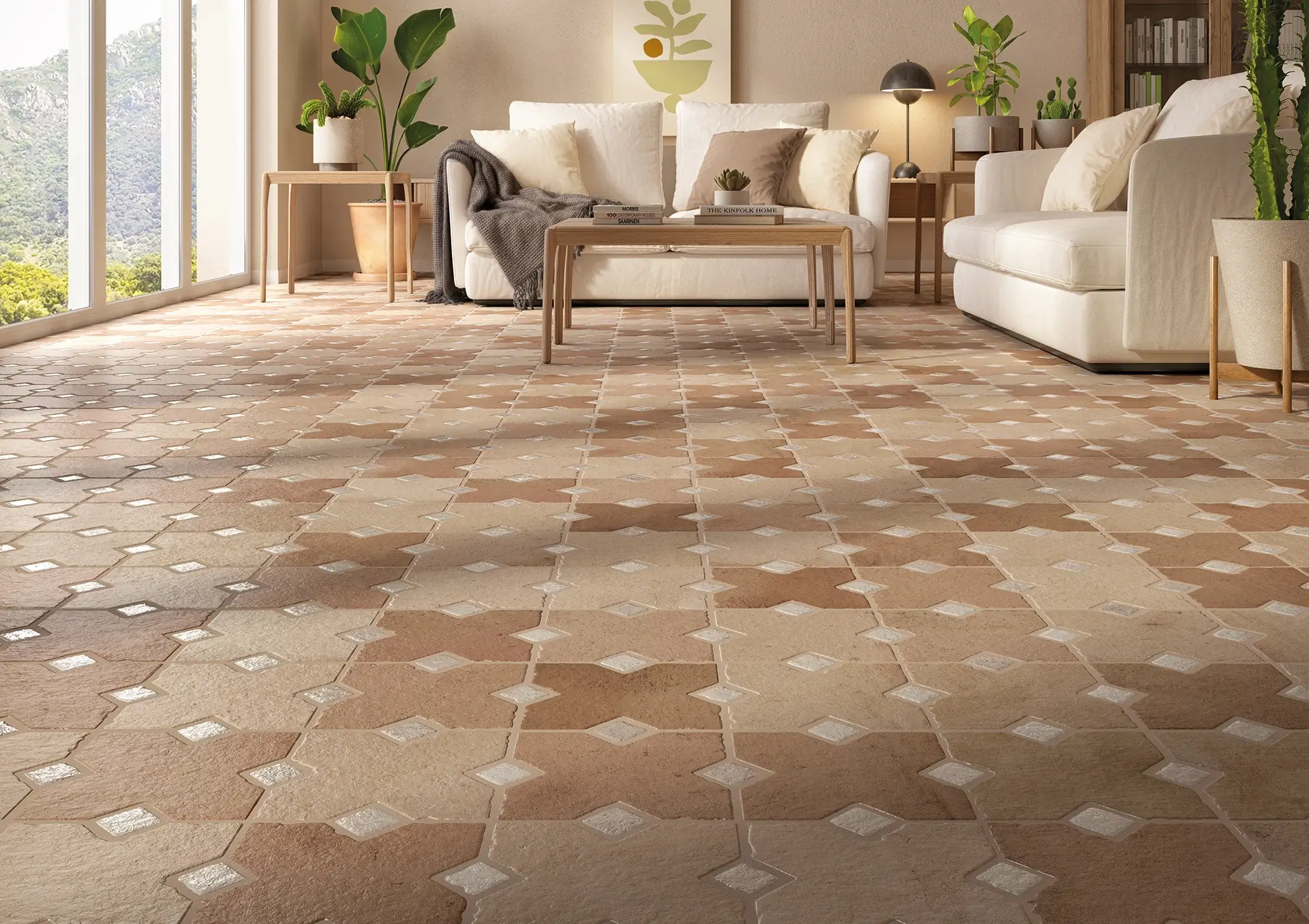 The Ruanes Series bridges rustic warmth and geometric precision. Weathered stone textures lock together in a rhythmic star and diamond tapestry, creating floors that feel established rather than just laid.